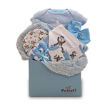 D’un ensemble douillet de vêtements (bavette, chapeau et bas) à un cache-couche en coton de goût en passant par la couverture d’emmaillotage, ce cadeau contient tout ce dont maman et papa ont besoin pour que leur petit homme se sente calme et à l’aise.