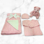 Ce pays des merveilles rose comprend une doudou adorable, un compagnon en peluche charmant et un habit en tricot qui feront certainement ressembler toute petite fille chérie à la royauté. Offrez l’amour et la vie en rose à une nouvelle ou une future maman aujourd’hui!