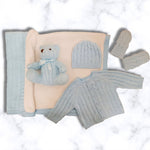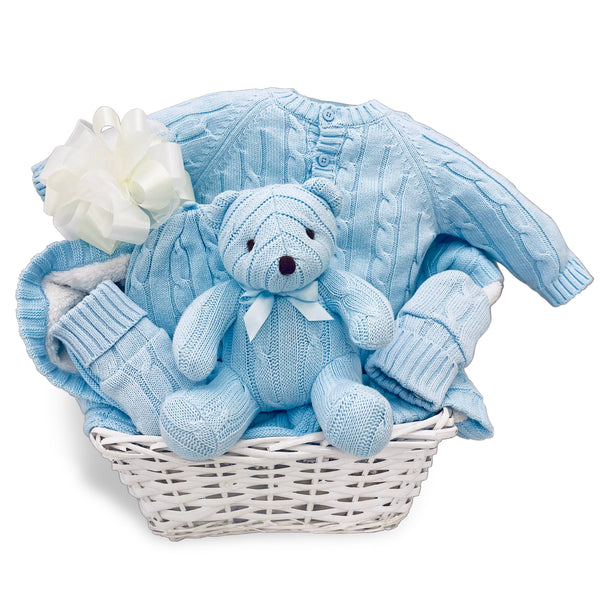 Ce pays des merveilles bleues comprend une doudou adorable, un compagnon en peluche charmant et un habit en tricot qui feront certainement ressembler tous nos chouchous à un membre de la famille royale. Offrez un paradis bleu et de l’amour à une nouvelle ou une future maman aujourd’hui!