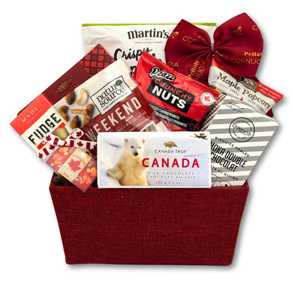 Regorgeant de délices locaux, ce panier saura ravir tous ceux qui sont fiers d'être Canadiens. Vos amis, collègues et proches se régaleront d’un assortiment de délices décadents provenant d'ici. Du meilleur sirop d’érable, du fudge à l’érable et un assortiment de collations croquantes, vos proches chanteront longtemps les louanges de ce cadeau patriotique!
